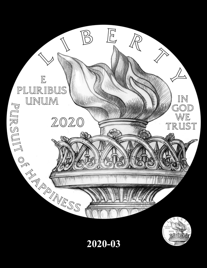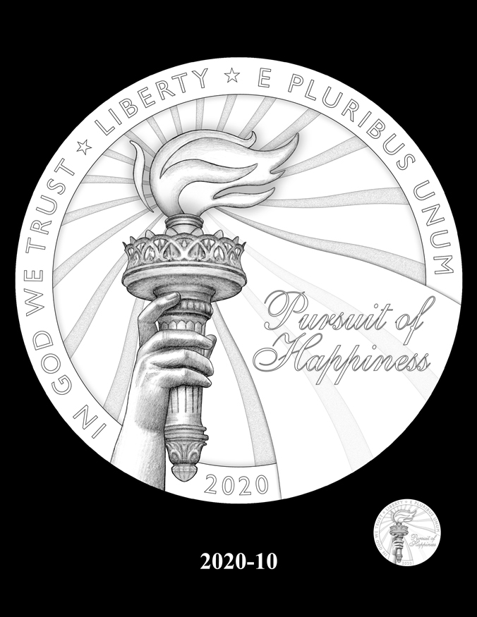 2020-10 shows a torch held aloft by the hand of Liberty, its flame and rays of light intensifying, fueled by life and liberty, guiding the way in the pursuit of happiness.