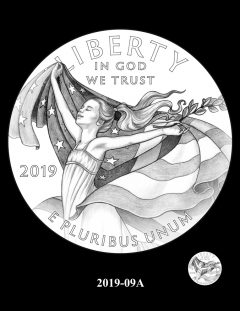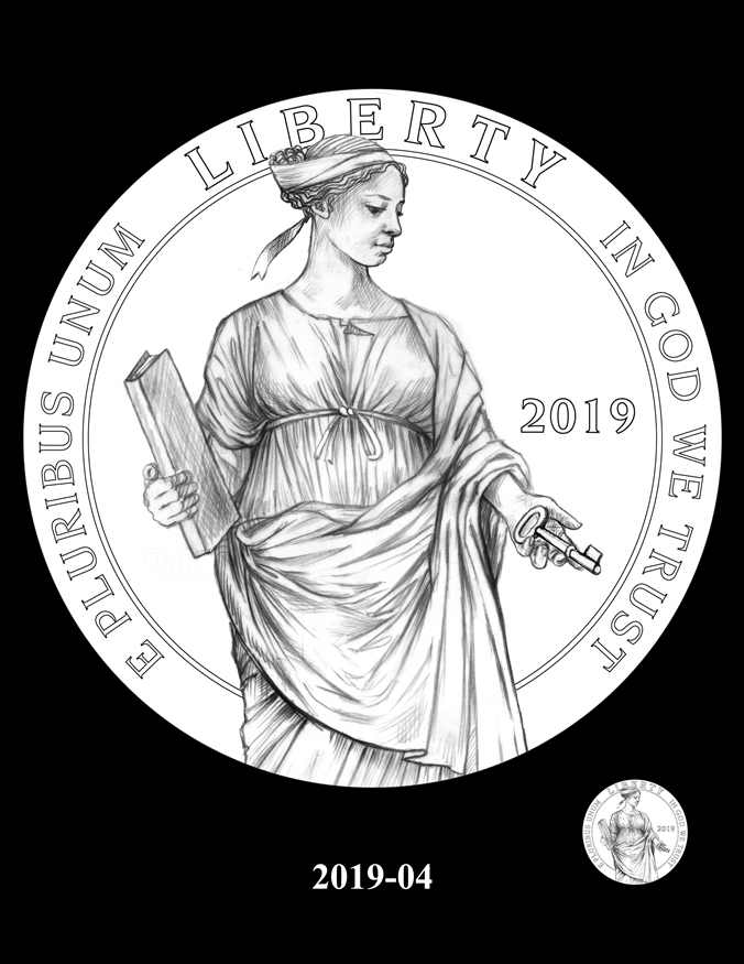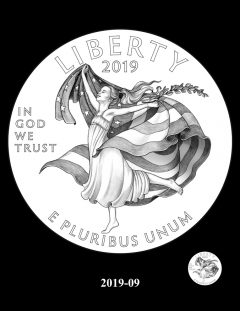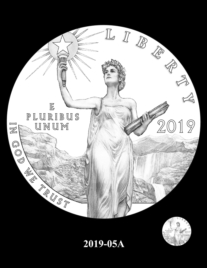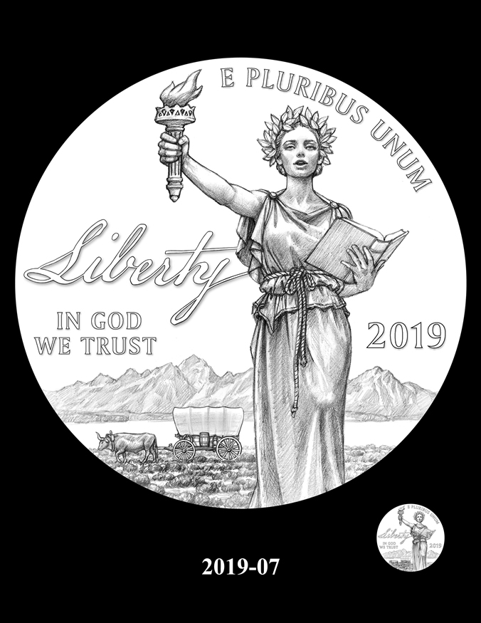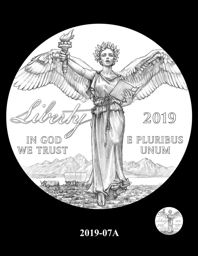 2019-07 and 2019-07A portray Lady Liberty keeping watch over prairies, lakes and mountains as pioneers head westward. The wild terrain featured in the background evokes the quintessential American spirit to explore new territory, the freedom to pursue new landscapes, new ideas and new ways of life. In the foreground Lady Liberty’s lips are parted, suggesting freedom of speech. Her torch is an emblem of the guiding light that liberty provides, while the book represents the rule of law and its equal application. Her wings in 2019-07A symbolize the freedom of movement, opportunity, and potential made possible by the preservation of liberty.