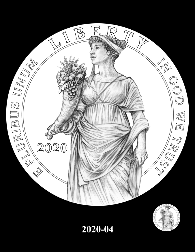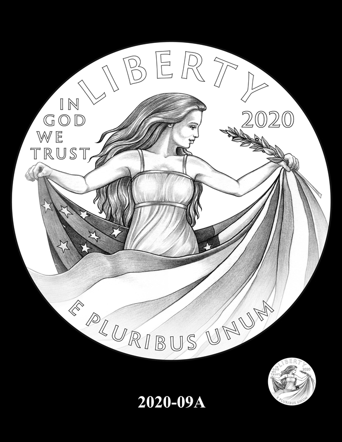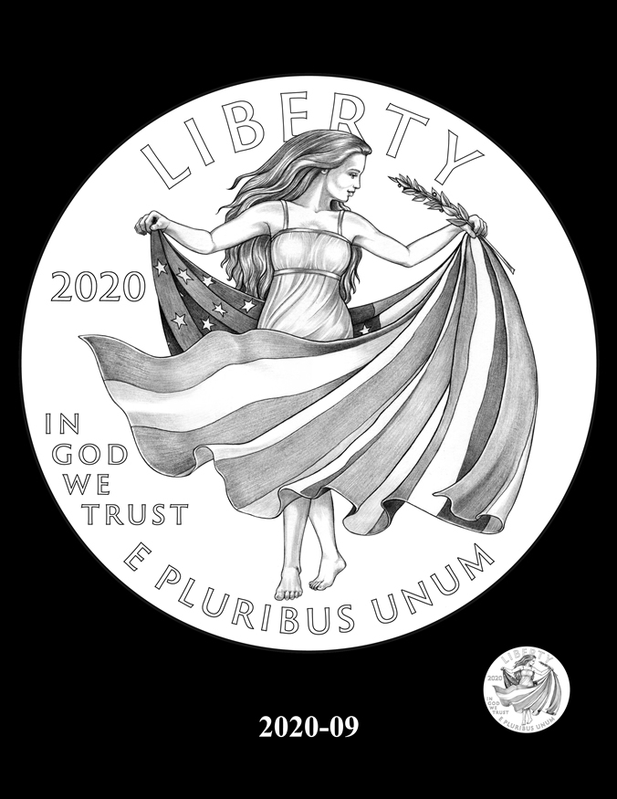 2020-09 and 2020-09A portray a mature woman, having been gifted with Life and Liberty, now in "pursuit of Happiness." The olive branch in her hand represents peace, while the American flag she holds twists in her graceful turns as she explores the opportunity around her.