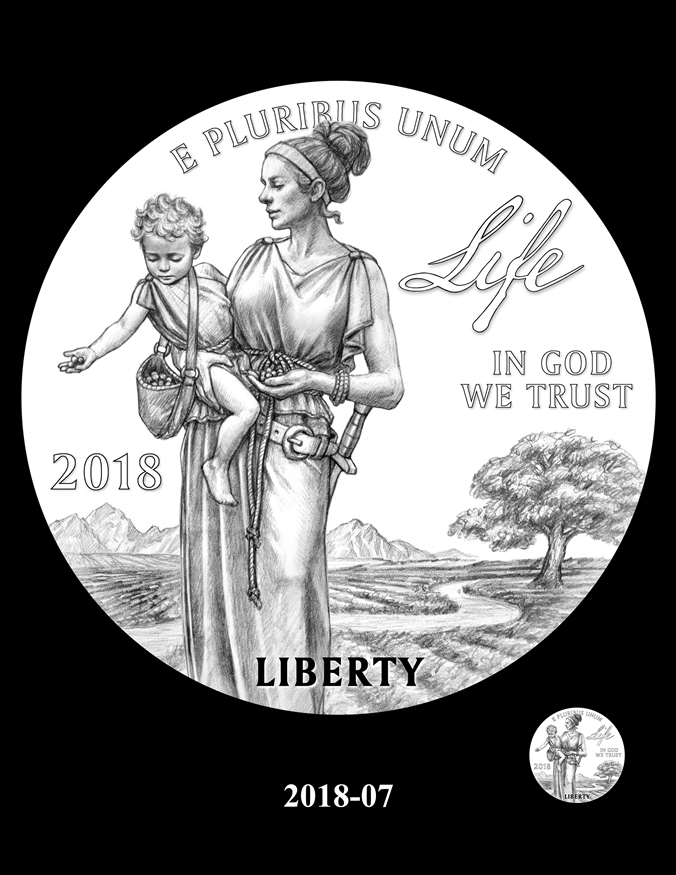 2018-07 feature "Life" personified by Lady Liberty teaching a small child to sow seeds in a field. The sword she carries symbolizes the power to defend life. The furrowed earth represents the forethought and labor required to sustain life; while the tree and stream represent Nature, suggesting the need to be good stewards of our environment which sustains life.