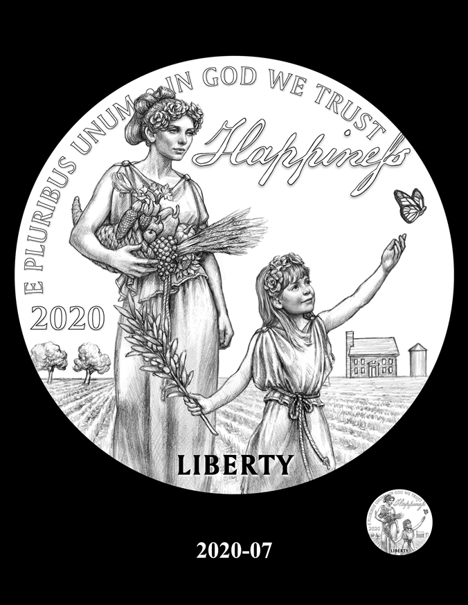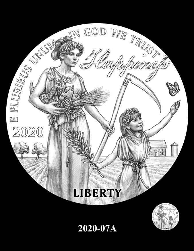 2020-7 and 2020-7A depict Lady Liberty harvesting the fruits of her labor with a young girl at play nearby. The overflowing cornucopia she carries is a symbol of the physical, intellectual, and spiritual bounty only liberty makes possible—the good things that nourish the body, enliven the mind, and satisfy the soul. The home, orchard, and silo represent American hopes, values, and aspirations and bring to a close the narrative told throughout the backgrounds of the series…from furrowed earth, to prairies and mountains and finally to an agrarian field. The stubble field, and scythe featured in 2020-07A, allude to the ingenuity and exertion required to claim liberty’s promise. The inscription "Happiness," a facsimile of the handwritten word from the Declaration of Independence, includes the long "s," a letterform which was typical of its time but is no longer in common use.