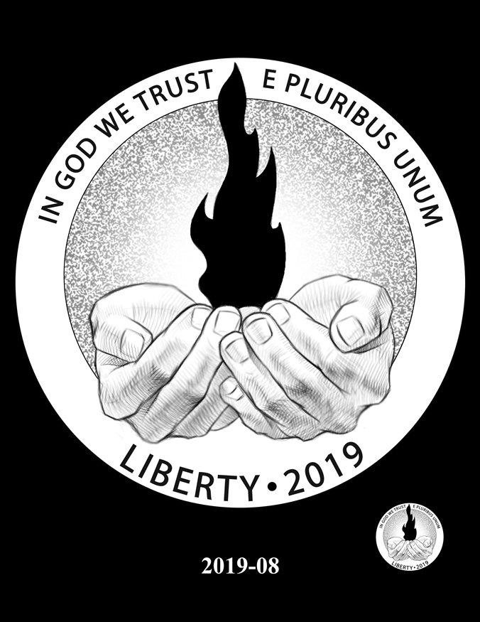 2019-08 depicts two hands nurturing and guarding the flame of liberty. This flame is the beacon which lights the way for all Americans towards their inheritance of liberty and freedom.