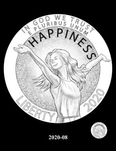 2020-08 portrays a young girl with her arms wide open as if to embrace the joy which surrounds her. She represents the optimism and collective opportunity for happiness available to all Americans.