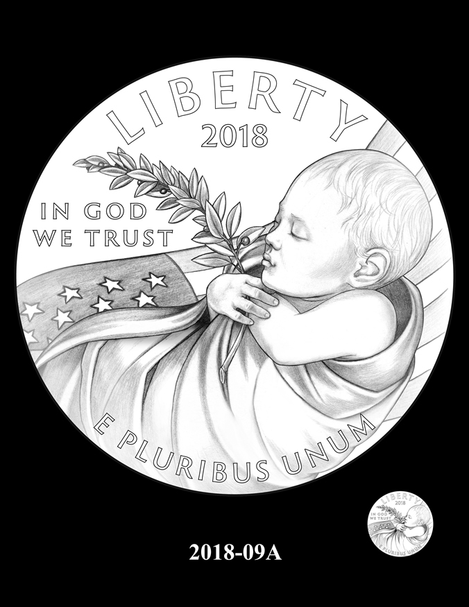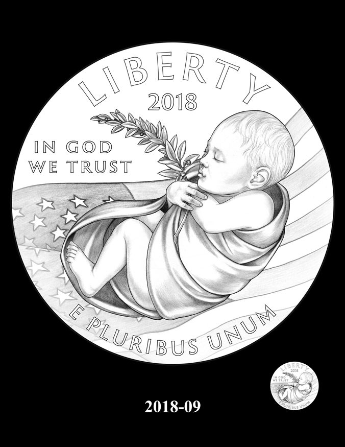 2018-09 and 2018-09A depict an infant symbolizing "Life", the first and most basic of Rights. The swaddled infant clutches an olive branch while, in the background, the American flag provides a protective and nurturing environment for life to begin.