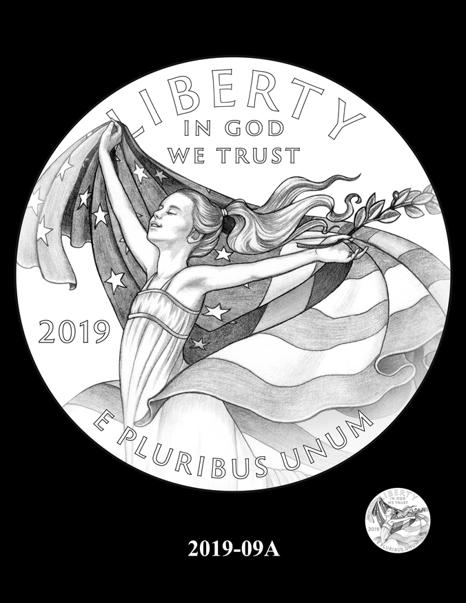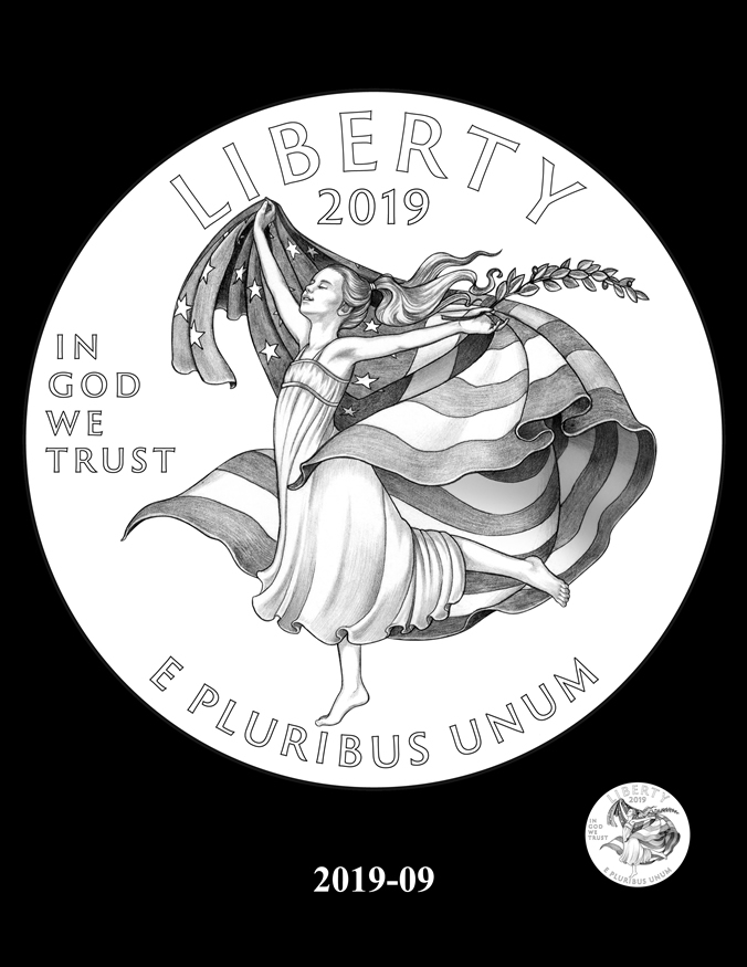 2019-09 and 2019-09A feature a young girl symbolizing "Liberty", holding an olive branch, representing peace, as the American flag billows around her, embodying her freedom to grow and flourish in body, mind and spirit.