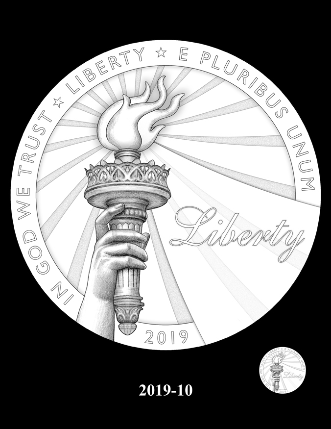 2019-10 portrays a torch held aloft by the hand of Liberty, its flame and rays of light growing stronger, reflecting the strength of the American people once they have obtained life and liberty.