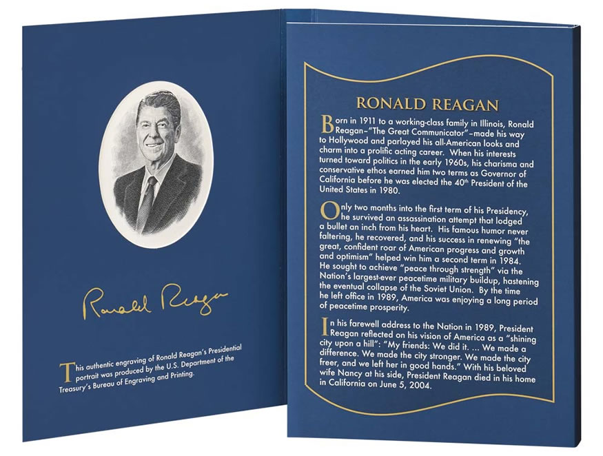 The set includes an engraved Ronald Reagan Presidential portrait that is produced from the Bureau of Engraving and Printing. The two coins, bronze medal, and engraving are displayed in a rich blue folder covered in soft-touch material with a handsome textured look and accompanied by a Certificate of Authenticity. Here are two U.S. Mint images of the set’s folder: