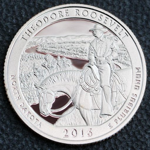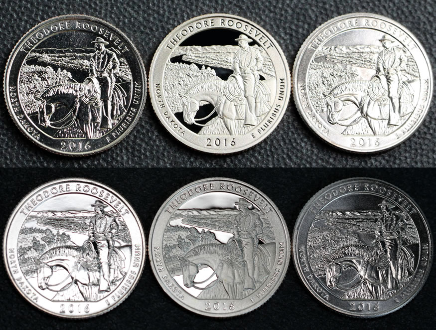 Theodore Roosevelt National Park quarters launched into circulation in late August near the time the U.S. Mint began selling rolls and bags of them in circulating quality. These are regular coins, although those in Mint rolls and bags have never circulated. Quarters within this new set, however, are specially produced in a higher quality and with different finishes, because they are intended for coin collectors. The three-coin set includes: