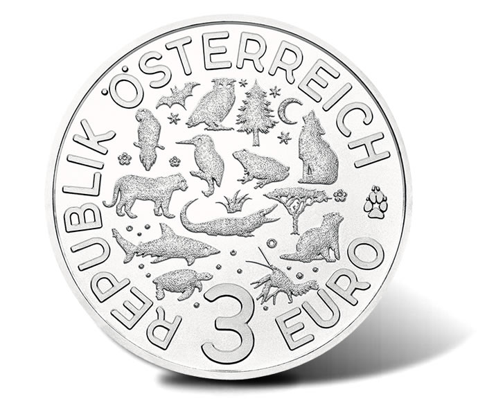 Obverses are common to all 12 coins. They depict miniature versions of the 12 creatures along with surrounding inscriptions of REPUBLIC, ÖSTERREICH, and 3 EURO.