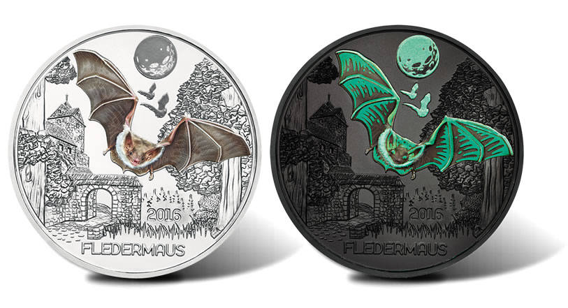 The Austrian Mint introduced its Colourful Creatures series with this month’s release of a coin depicting the fledermaus (bat). The Mint’s first ever €3 collection includes 12 coins that glow in the dark.