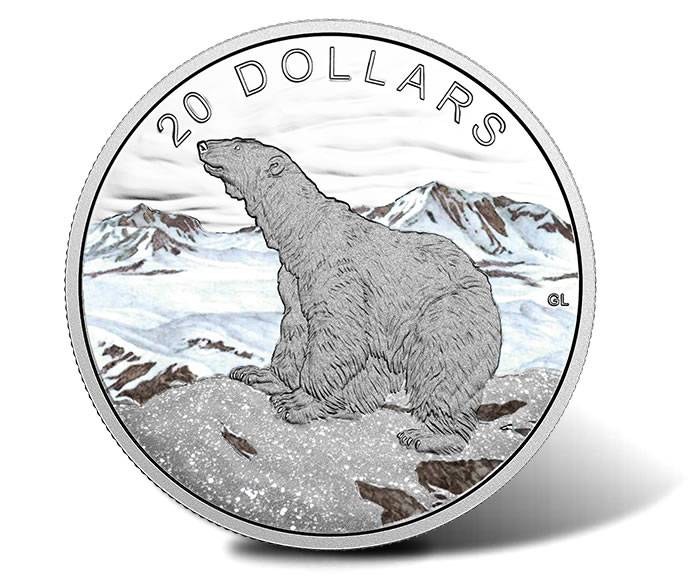 The coin’s reverse artistry is the work of Glen Loates. His design depicts a standing polar bear as it moves across rugged terrain. Selective coloring highlights the snow-covered hills in the background and special diamond glitter simulates the snow and ice underfoot. Inscriptions include 20 DOLLARS and GL for the artist’s initials.