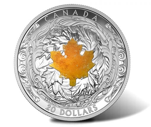 The Royal Canadian Mint’s first coin with a similar embellishment was its 2016 $20 Majestic Maple Leaves with Drusy Stone 1 oz. Silver Coin.