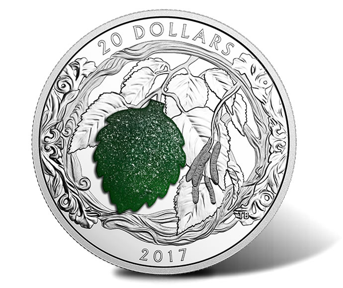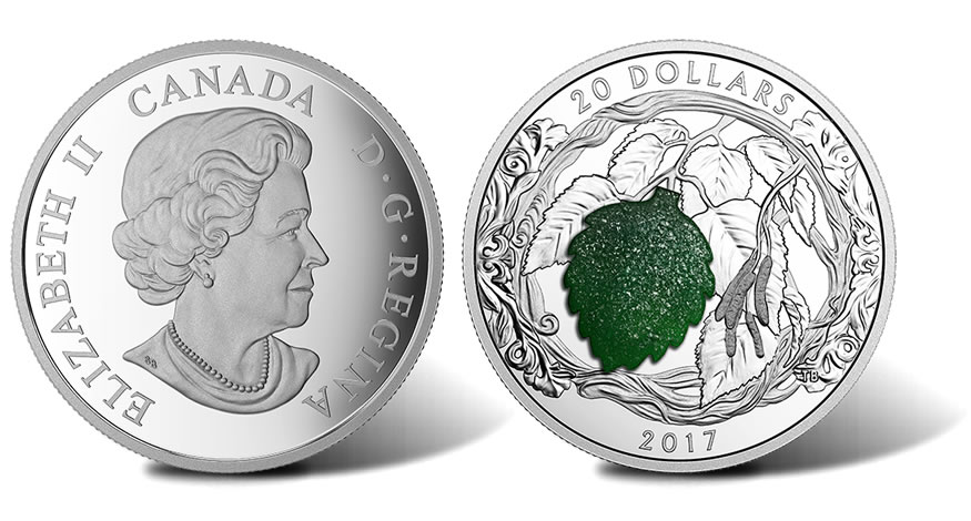 New from the Royal Canadian Mint is a $20 silver coin that depicts a cluster of birch leaves with one prominently featuring a semi-precious stone embellishment. This is the second coin with such a treatment. The first one sold out.