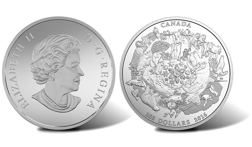 Canadian artist Bonnie Ross created the coin’s reverse or tails side design. The 360-degree image pays homage to Canada’s Arctic with scenes that include a sleigh and team of dogs, a polar bear, an igloo, a fox, a snowy owl, a hare, a walrus, whale, birds and fish.