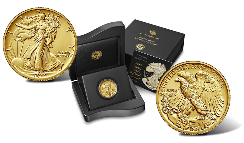 The half-dollar is the last of three gold pieces to celebrate popular designs introduced 100 years ago. The first two are renditions of the 1916 Mercury dime and the 1916 Standing Liberty quarter.