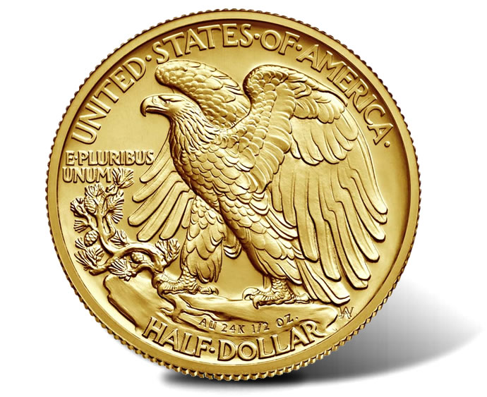 Reverses feature an American eagle rising from a mountaintop perch. Surrounding the design are inscriptions of UNITED STATES OF AMERICA, E PLURIBUS UNUM, HALF DOLLAR and AW for Weinman’s initials. In addition, and unlike the original silver half-dollars, there are inscriptions of AU, 24K, 1/2 OZ. Its one-half ounce weight is symbolic of the coin’s denomination, as is its business strike.