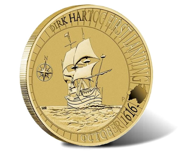 Created by Wade Robinson, the reverse depicts a telescopic view of Dirk Hartog’s ship, the Eendracht, sailing across the ocean aside a compass rose. Surrounding inscriptions include DIRK HARTOG FIRST LANDING, OCTOBER, 1616, a map outline of Australia, and the Perth Mint’s ‘P’ mintmark.