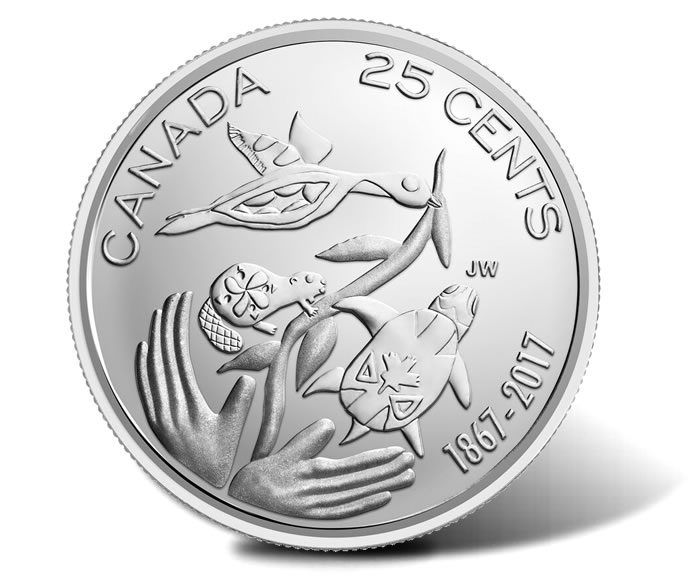 Around the scene are inscriptions of CANADA, 1867-2017, 25 CENTS, and JW for Wong’s initials.