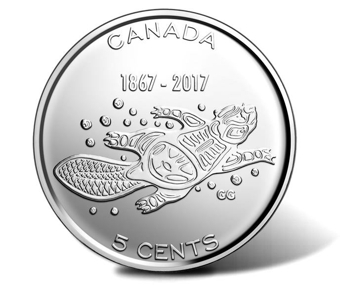 Surrounding the beaver are inscriptions of CANADA, 1867-2017, 5 CENTS, and GG for Gloade’s initials.