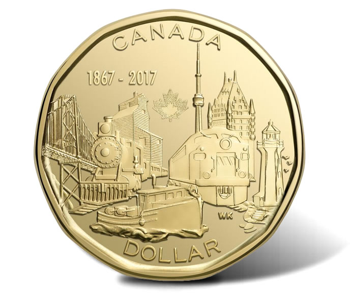 Above the depictions are inscriptions of CANADA and 1867-2017. Below them are DOLLAR and WK for Klassen’s initials.