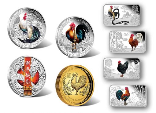 Serving as the premier issue is a high-relief Year of the Rooster Gold Coin. It is joined by the Wealth & Wisdom Silver Two-Coin Set, a Year of the Rooster Silver Proof Four-Coin Set, and a Chinese New Year Dragon Silver Coin.
