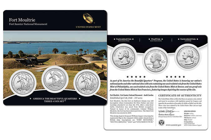 A plastic card with a scenic photo of Fort Moultrie holds the coins. The card’s back offers information about the fort, the quarters’ design, and a certificate of authenticity.