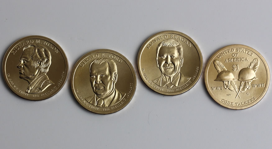Three of the coins are issued as part of the U.S. Mint’s Presidential $1 Coin Program (read about recent releases), which was introduced in 2007 and ends this year with dollars honoring the 37th, 38th and 40th Presidents. Obverses (heads sides) feature a president’s portrait while reverses share a common rendition of the Statue of Liberty.
