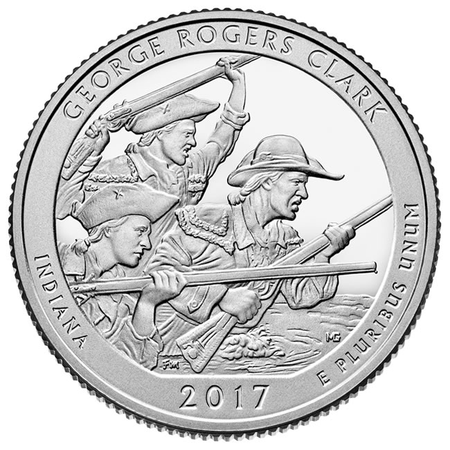The Happy Birthday Coin Set has the 2017-S George Rogers Clark National Historical Park Quarter for Indiana. It shows Clark leading his men through the flooded plains approaching Fort Sackville.