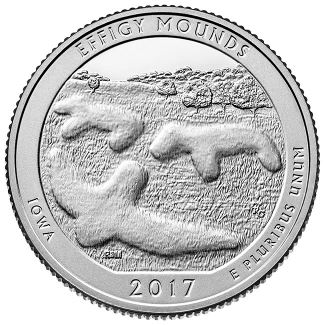 The Birth Set includes the 2017-S Proof Effigy Mounds National Monument Quarter for Iowa, which depicts an aerial view of mounds in the Marching Bear Group.