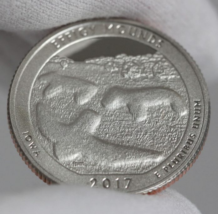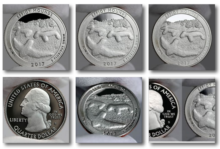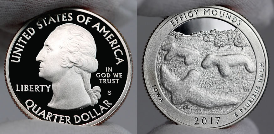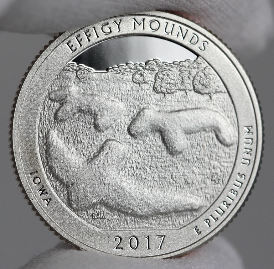 Earlier this year, on Jan. 5, the U.S. Mint started selling proofs of all five 2017 quarters. Proof coins are minted for coin collectors, featuring sharper design detail, frosted foregrounds, and mirror-like backgrounds. To offer a better look at the Effigy Mounds quarter, we snapped several photos of proofs and share them now.