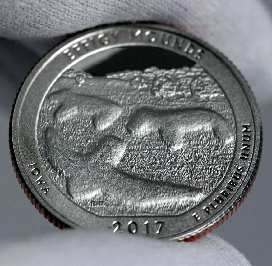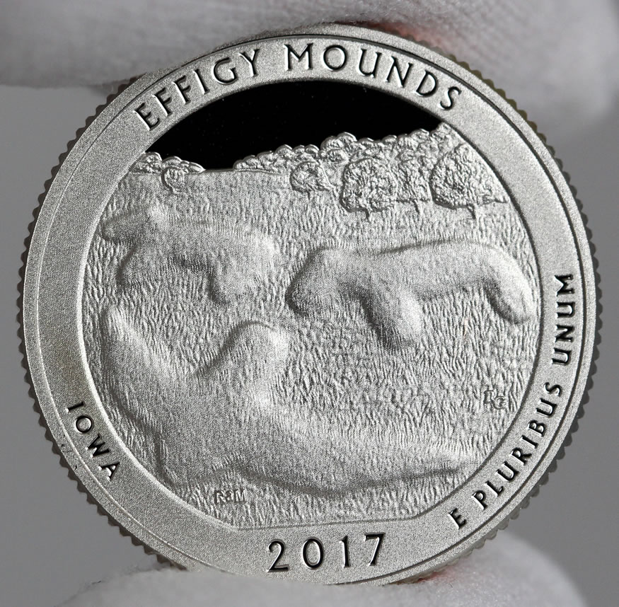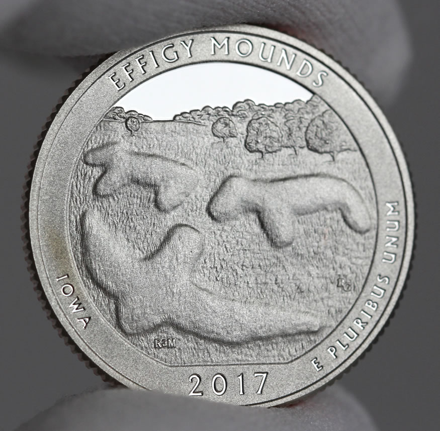 Reverses of each America the Beautiful Quarter are emblematic of the site they honor. The quarter for Iowa is the 36th issue in the ATB series and the first of five for 2017. Designed by Richard Masters and sculpted by Renata Gordon, the Effigy Mounds quarter depicts an aerial view of mounds in the Marching Bear Group. War. It was selected after some refinements following a review of 13 candidate designs. Inscribed around the design are EFFIGY MOUNDS, IOWA, 2017, and E PLURIBUS UNUM.