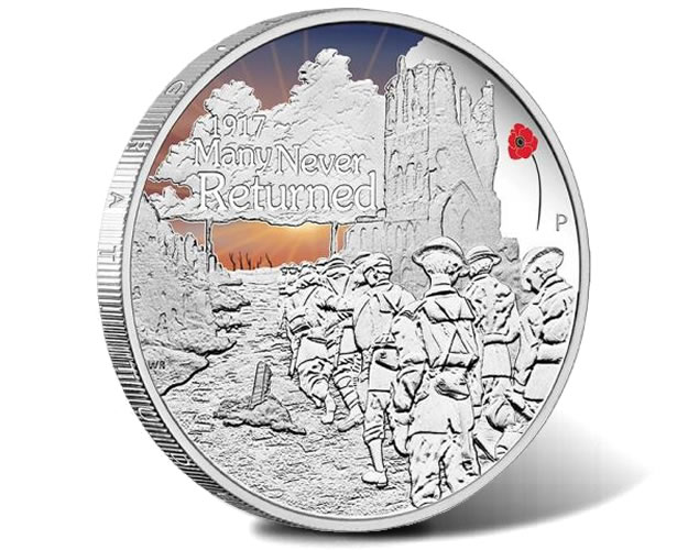 The Perth Mint commemorates the Third Battle of Ypres in its newest release from the ANZAC Spirit 100th Anniversary Coin Series with the 2017 Many Never Returned 1 oz Silver Proof Coin. Its reverse shows a group of Australian soldiers as they walk through the Menin Gate, past the Cloth Hall, on their return to Ypres from the battlefields of the Ypres Salient.