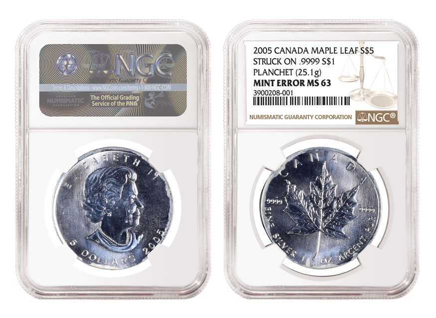 Numismatic Guaranty Corporation (NGC) certified a unique and rare mint error, a Canadian 2005 $5 Silver Maple Leaf (SML) struck on a planchet intended for smaller silver dollars.