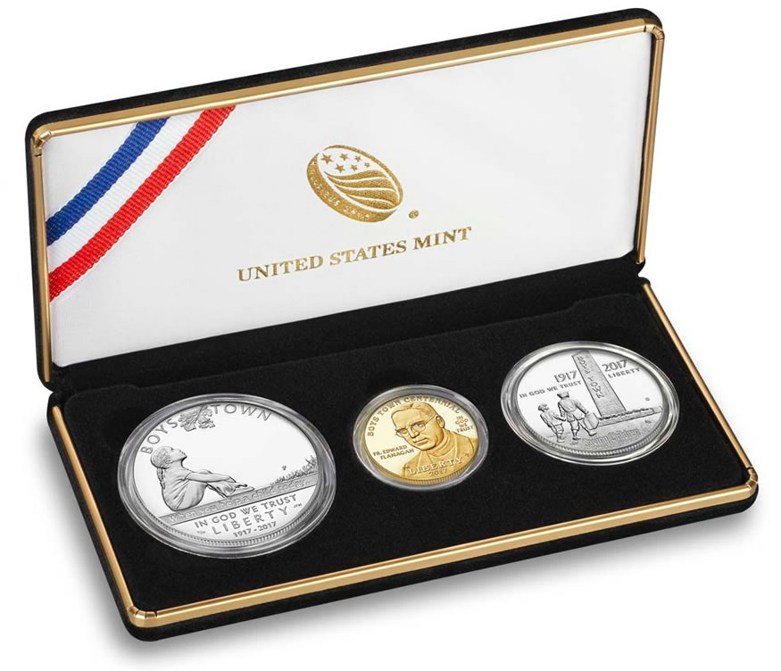 The United States Mint published images, product options, and limits for upcoming coins and a companion set that commemorate the 100th anniversary of Boys Town.