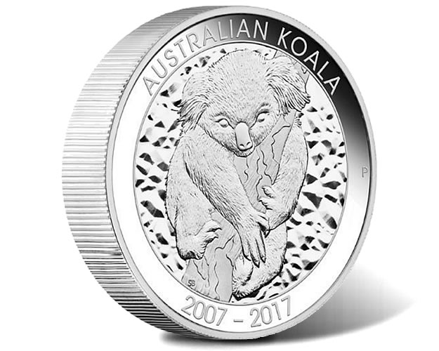 Celebrating the 10th anniversary of the Australian Koala coin which debuted in 2007, the Perth Mint has issued this special release produced to proof quality from ten ounces of 99.9% pure silver. Seen on the reverse is the original koala design from a decade ago.
