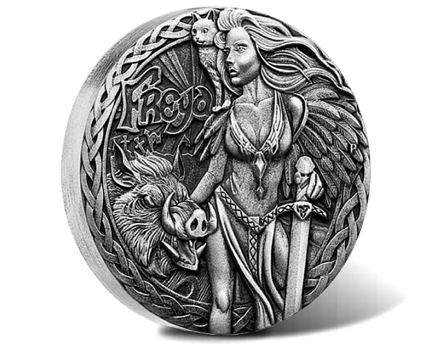 Silver antiqued coins in high relief and rimless format have been popular from the Perth Mint, and this one portraying the Norse goddess Freya will likely continue that trend. This first issue from the new Norse Goddesses series shows a high relief design depicting Freya, the goddess of love, beauty, fertility, battle and death. In her left hand is a sword with her golden bristled boar ‘Hildisvini’ to her right.