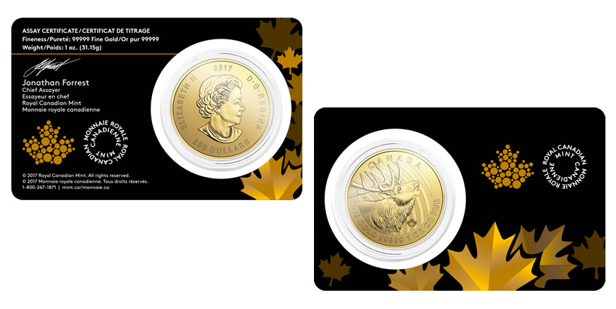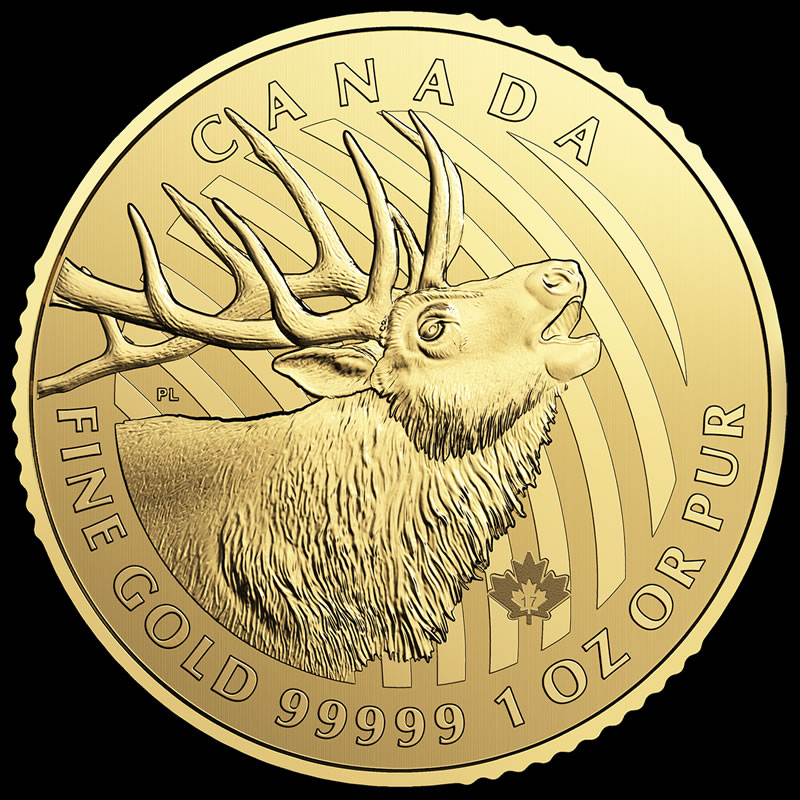 Designed by Canadian artist Pierre Leduc, the elk appears against 8 thick lines representing the sound waves of the animal’s distinct bugle. Inscriptions around the design are CANADA, FINE GOLD, 99999 and 1 OZ OR PUR.