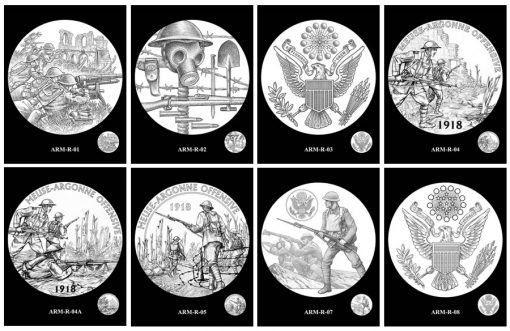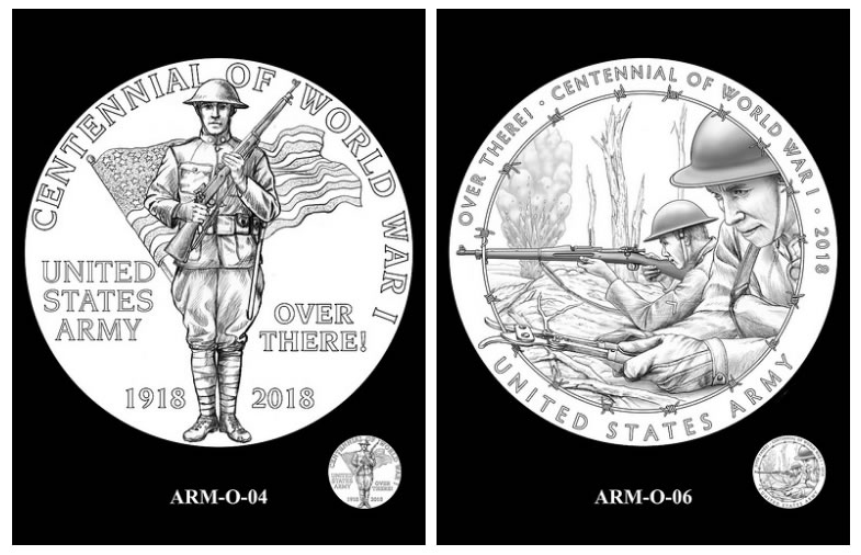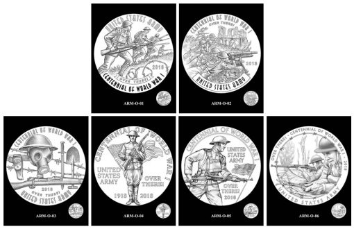 Artists for the U.S. Mint created over 60 design candidates for the five 2018 World War I Armed Forces Silver Medals. The other medals will honor the Navy (see Navy medal designs), Air Service (see Air Service medal designs), Marines (see Marines medal designs) and Coast Guard (see Coast Guard medal designs).