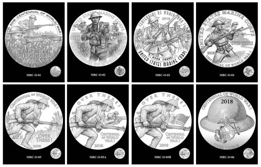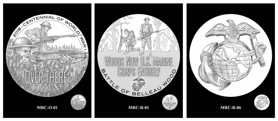 Artists for the U.S. Mint created over 60 design candidates for the five 2018 World War I Armed Forces Silver Medals. The other medals will honor the Army (see Army medal designs), Navy (see Navy medal designs), Air Service (see Air Service medal designs) and Coast Guard (see Coast Guard medal designs).