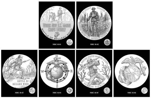 The six Marines medal reverse candidates and U.S. Mint descriptions of them follow.
