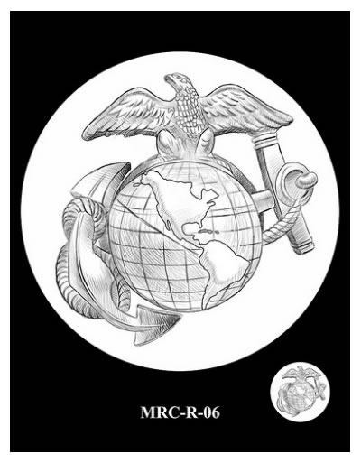 The CFA’s and CCAC’s recommended reverse, MRC-R-06, features the Marines’ eagle, globe, and anchor emblem without extraneous elements.