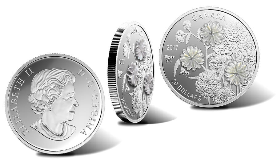 Coin reverses (tails side) depict the pearl yarrow (Achillea ptarmica) with three floral-shaped embellishments crafted from mother-of-pearl to re-create the flower’s snow-white double blooms. Two bees are seen approaching from the left. The design was crafted by Canadian artist Margaret Best. Inscriptions around the artwork include CANADA, 20 DOLLARS, 2017 and MB for the artist’s initials.
