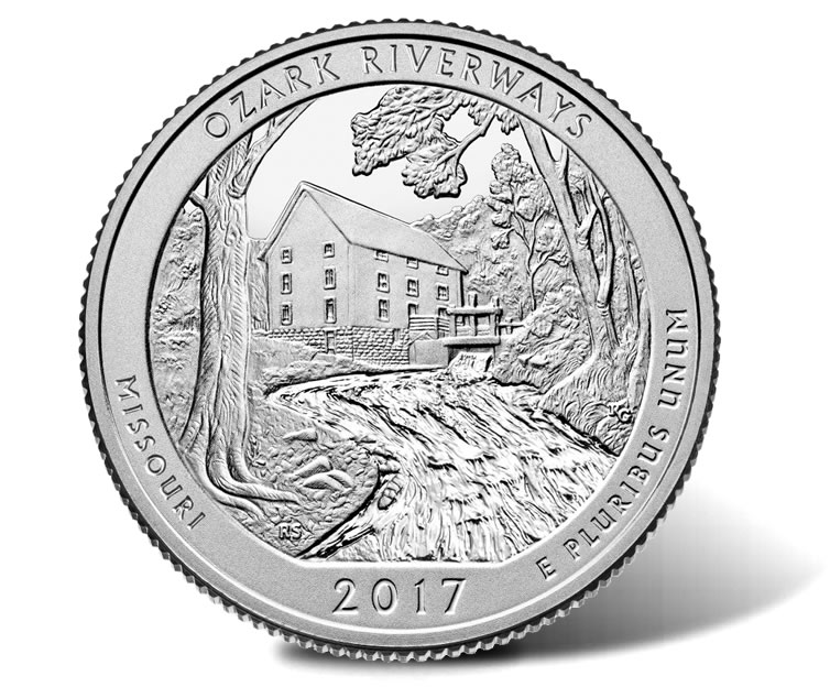 Ozark Riverways quarters also enter circulation on June 5, but it can take months, possibly years, before they’ll appear in regular change. That’s because the Federal Reserve System distributes coins to financial institutions without regard to their designs. The official ceremony offers an early opportunity to get this particular one of five 2017-dated quarters. The United States Mint offers another opportunity by selling them in rolls and bags.
