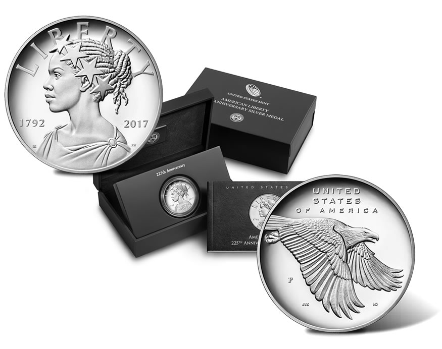 All five medals are produced from the same silver blanks that are used in making American Silver Eagles. They lack coin-mandated inscriptions, providing for a taller obverse profile of Lady Liberty than seen on the gold coin. They also do not have the 225th anniversary inscriptions which appear on the gold coin’s edge.