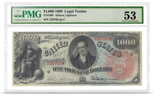 - the only 1869 $500 and $1,000 Rainbow notes in private hands (graded PMG AU 53 EPQ and PMG AU 53, respectively),
