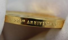 Unlike the gold coin, the medal is not in high-relief. In addition, its edge is flat without lettering while the gold piece bears three repeating but separating inscriptions of ★ 225th ANNIVERSARY ★. These photos are of the edges of a silver medal and gold coin.