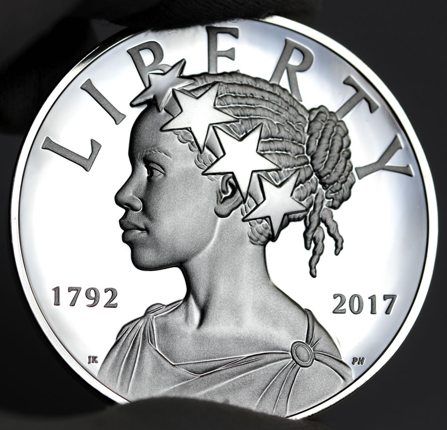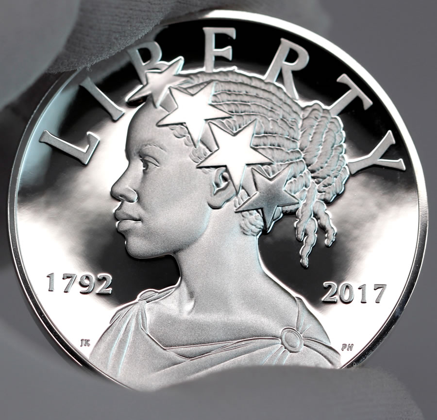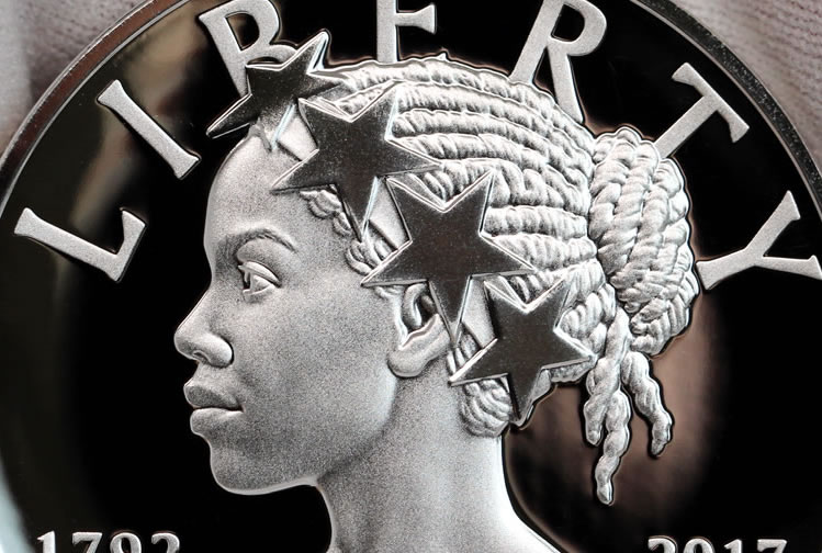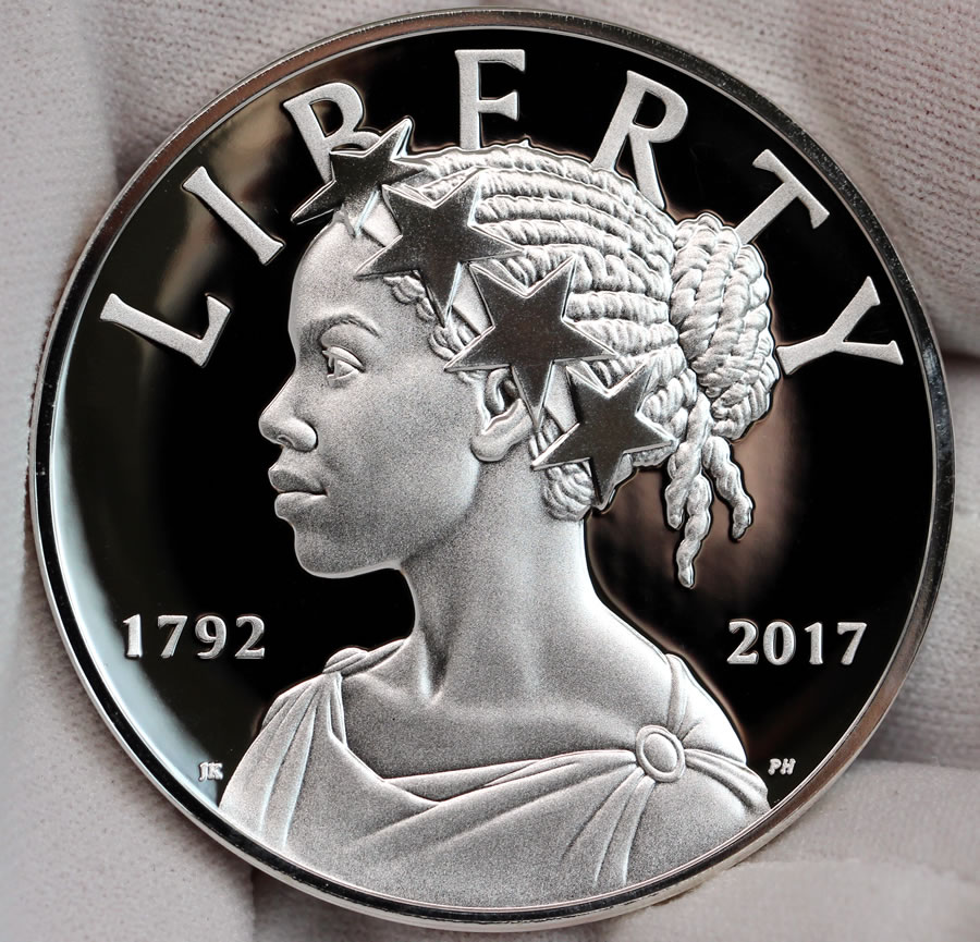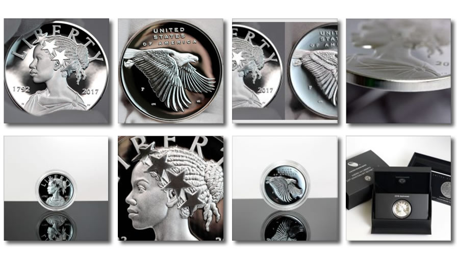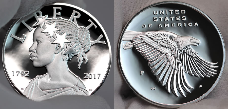 Silver medal obverses show Liberty rendered as an African-American woman wearing a crown of five-pointed stars. Reverses depict an eagle in flight. Here’s a pair of photos showing both sides: