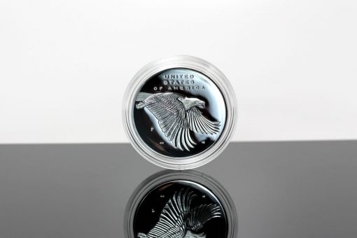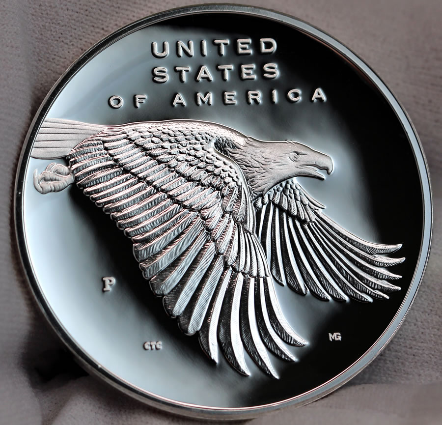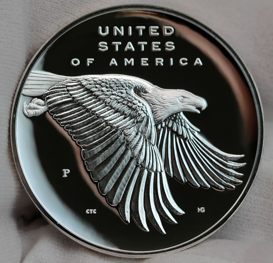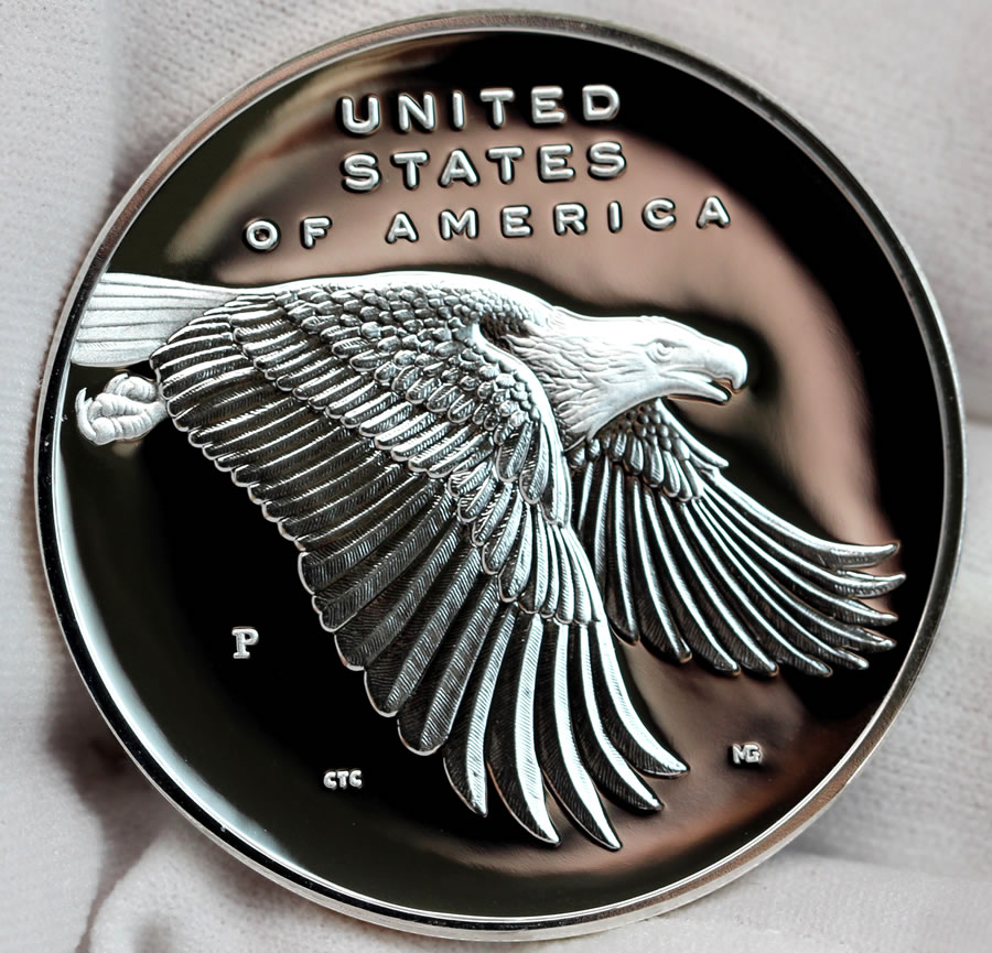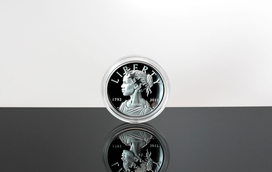 Silver medal obverses show Liberty rendered as an African-American woman wearing a crown of five-pointed stars. Reverses depict an eagle in flight. Here’s a pair of photos showing both sides: