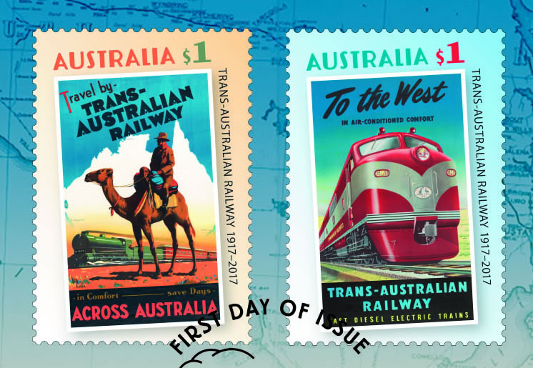 The official Australia Post $1 stamps feature vintage travel posters. The "Across the Australia" stamp depicts an iconic circa 1930 poster showing a figure on a camel viewing a G-class locomotive as it speeds across the desert. The "To the West" stamp showcases a stylized train, the first diesel locomotive GM1, in service between 1951 and 1967.