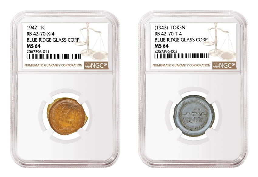 NGC certified 17 experimental pieces by Blue Ridge, including 9 pattern cents struck on amber-colored glass blanks and 8 glass tokens. Seven of the glass cents are intact, and were graded from NGC MS 62 to NGC MS 64. Two are fragments NGC attributed but did not grade.